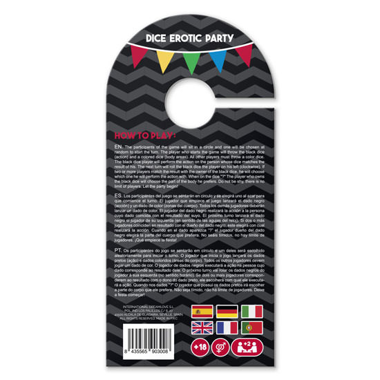 El juego sexual Erotic Party es el mejor complemento para las reuniones sociales. Todas las personas que participen deberán sentarse en circulo y al azar se elegirá una para empiece el turno. La persona que empiece con el juego lanzará el dado de color negro (acciones) y un dado de color azul (zonas del cuerpo), las demás personas lanzarán el dado de un color. La persona que lanzó el primer dado de color negro realizará la acción a la persona que tenga cuyo dado coincida con el resultado del suyo. En el próximo turno seguirá el juego con la persona del lado izquierdo que inició el juego y así sucesivamente. Si más de una persona coincide con el resultado de la persona del dado negro, éste elegirá a la persona. Si al tirar el dado aparece el símbolo interrogante, la persona dueña del dado negro elegirá la parte del cuerpo que prefiera. ¡Que empiece la fiesta!