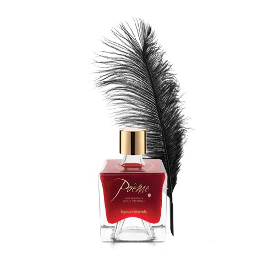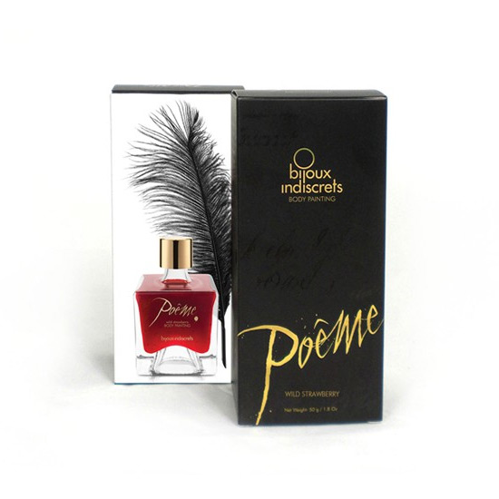 ¡Convierte a tu pareja en tu postre favorito con esta Pintura Comestible Poeme! Disfruta de su cuerpo de una forma más intensa penetrando versos y dibujos en su piel, provocarás momentos de auténtico deseo y pasión. Esta Pintura Comestible Poeme es de textura fundente, con exquisito aroma y sabor. Podrás escribir y dibujar todo lo que quieras y luego comerte a besos tu cuerpo favorito. ¡Será como comer un postre gourmet! La Pintura Comestible Poeme está disponible en cuatro sabores, caramelo, chocolate negro, fresa, cereza y donut. ¡Mmmm…disfruta de la magia sexual con los cinco sentidos!