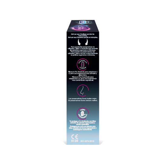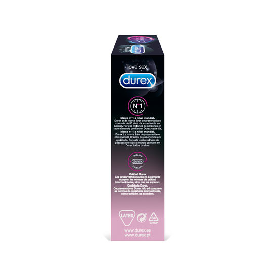 Los preservativos Durex mutual climax aumentan el placer en las relaciones gracias a sus estrías y puntos. Los preservativos Durex mutual climax contienen un 5% de benzocaína, ingrediente que ayuda a retrasar la eyaculación. Están fabricados con látex natural y con el diseño Easy-On. Son fáciles de colocar, son cómodos y se ajustan muy bien al pene. Los preservativos Durex mutual climax son transparentes, no contienen aroma, ni sabor y vienen lubricados para facilitar la penetración.
